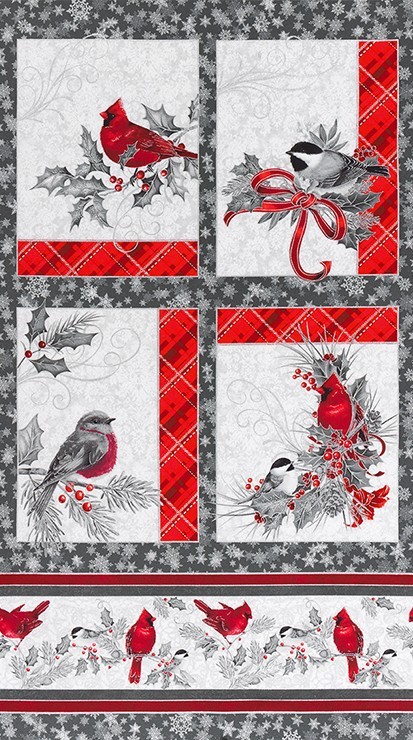 Et flot panel med 4 billeder – størrelse ca. b 30 x h 25 i grå nuancer med røde fugle og med sølv fra Robert Kaufman.