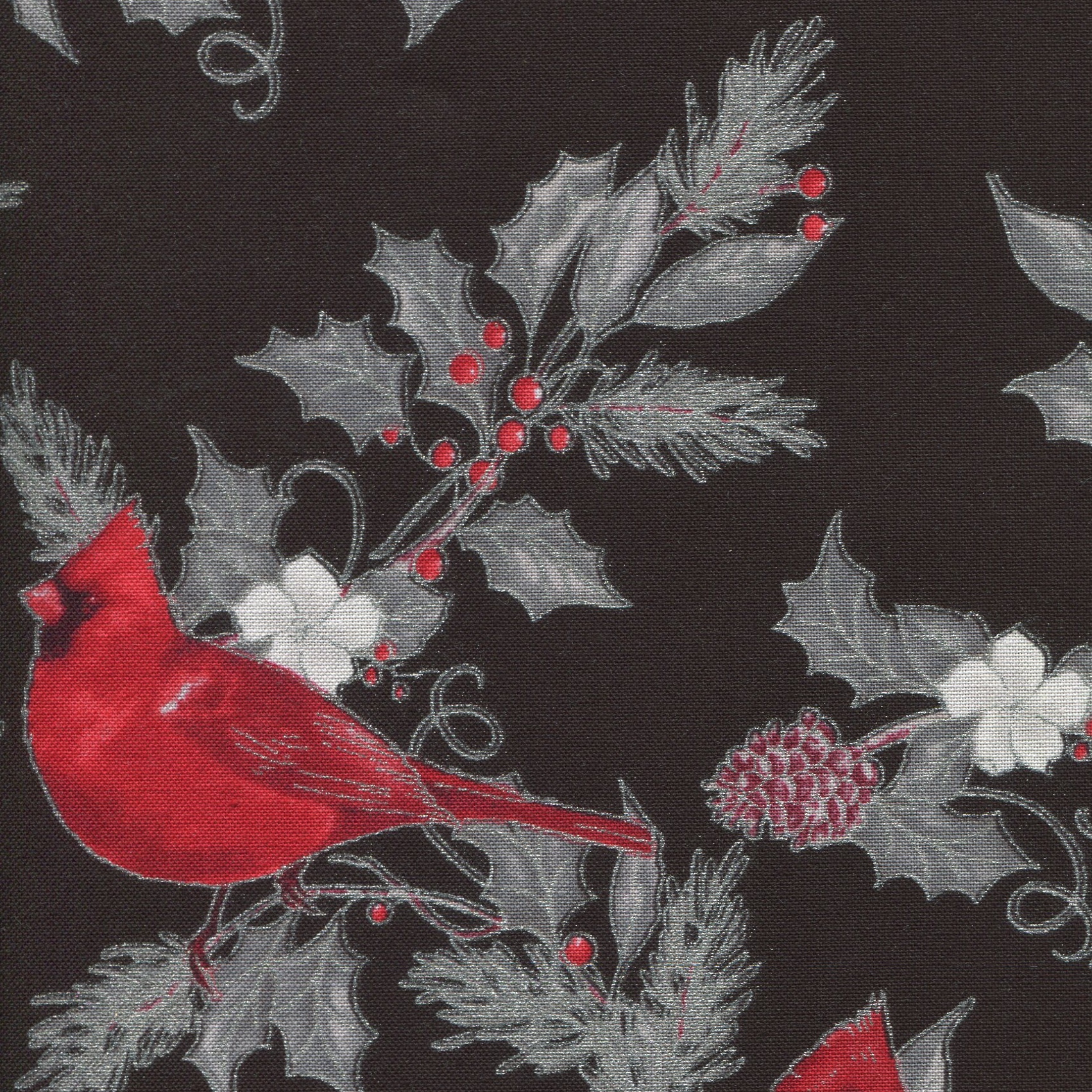 Winther’s Grandeur – sort bund med flotte røde fugle og blade i grå nuancer med sølv.